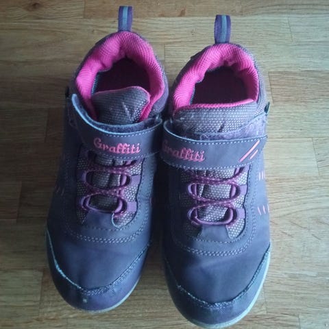 Asics barnesko i størrelse 33, egnet for både gutter og jenter. Skoene har en fargekombinasjon med rosa og lilla nyanser. Designet for barn med justerbar borrelås og snøring for sikker passform.