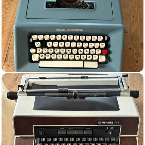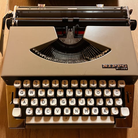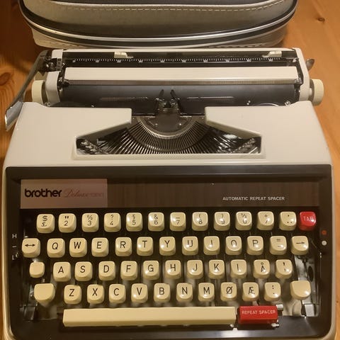 Optima Elite skrivemaskin i grå farge. Manuell skrivemaskin med tastatur for tekstinnskriving. Leveres med boks for oppbevaring.