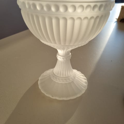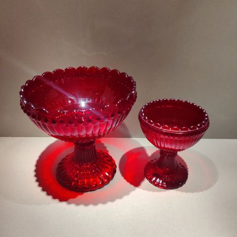 Marimekko skål på stett i klart glass. Høyde ca 15 cm. Fin til både småkaker og snacks, bær osv. Feilfri