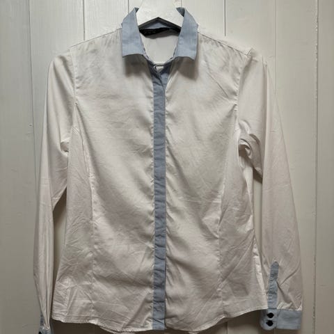 Zara skjorte i størrelse S, laget av bomull. Skjorten er hvit med pen detalj av brune knapper både foran og ved mansjettene.