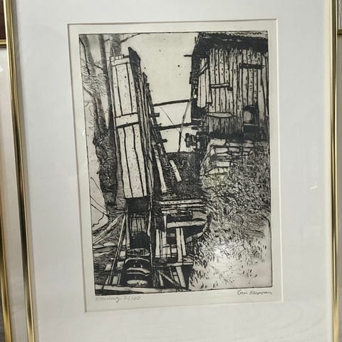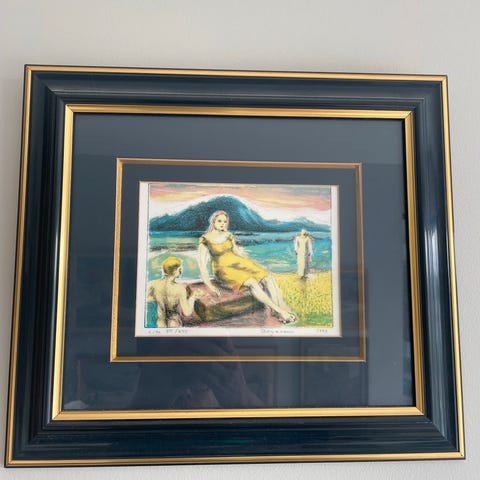 Signert akvarell som viser gatepartier med bygninger, trapper og blomster, det er innrammet med passepartout. Signaturen er tydelig på akvarellen, papir med akvarelltekstur.