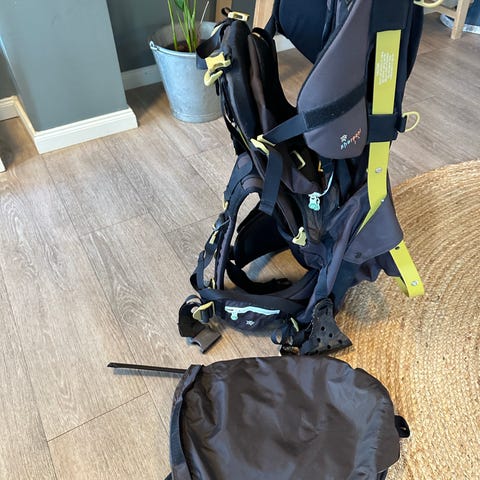 Polstret bæresystem med justerbare skulderstropper og hoftebelte. Integrert ryggsekk for oppbevaring.