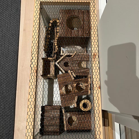 Følger med inngjerding som kan brukes under lek og rengjøring av bur. Samt vannflaske, matskål og sandkasse.