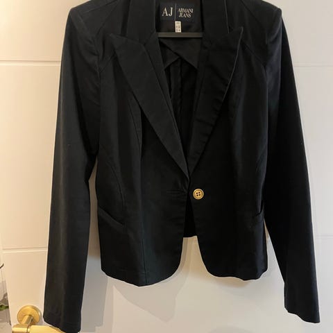Armani Jeans blazer i grå farge, laget av bomull. Denne damemodellen har størrelse L og har en klassisk design med knapper foran og lommer. Blazeren er egnet for formelle og uformelle anledninger.
