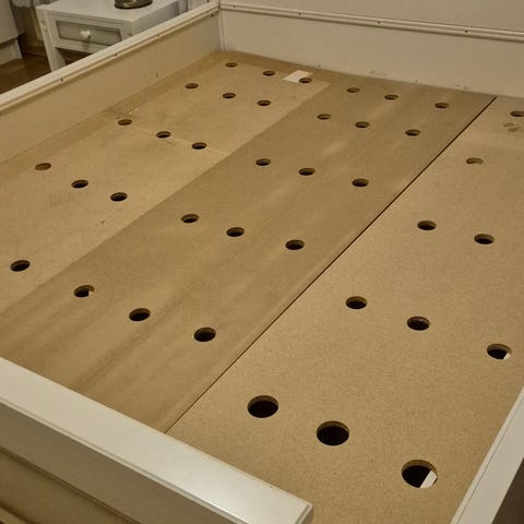 Ramme og rammemadrass fra jysk. Rammen er enkel å montere og demontere. Farge mørkeblå og svart.
