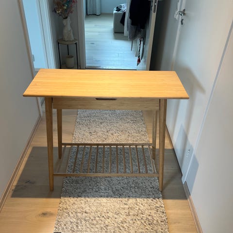 Selger et pent og moderne lite bord i lyst tre. Perfekt som sidebord, nattbord eller dekorbord. Bordet har to hyller og tar liten plass, men er samtidig veldig praktisk til oppbevaring av bøker, planter eller pynt.