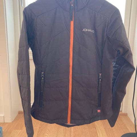 Jakken er rød med sorte og hvite detaljer.