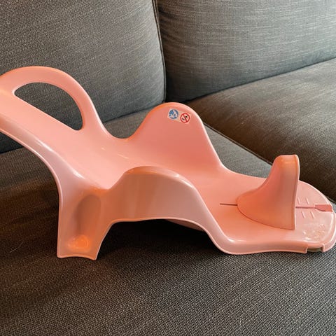 IKEA ps Lömsk lenestol til barn med rund form og hvit farge. Stolen har en oransje sittepute og en hvit solskjerm som kan trekkes over.