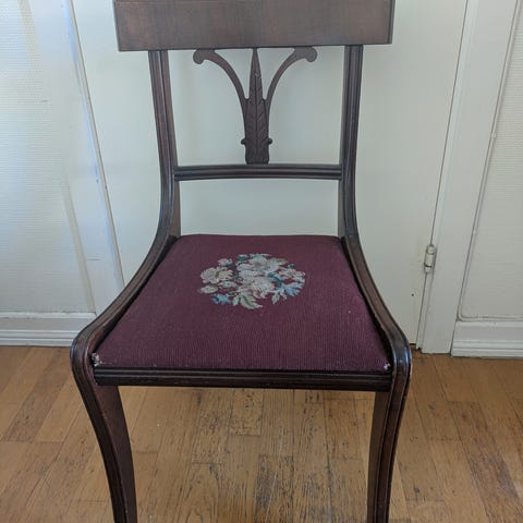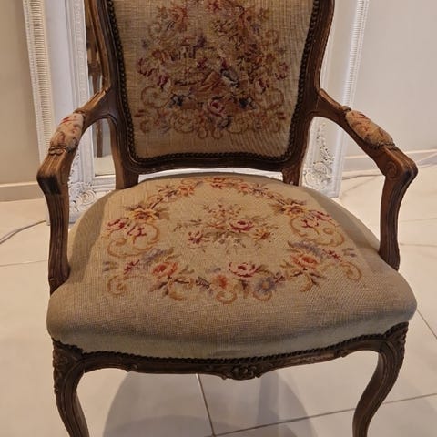 Antikk lenestol med ramme i tre og polstring i gul fløyel. Stolen har armlener og en klassisk design som passer til moderne og tidløse interiører.