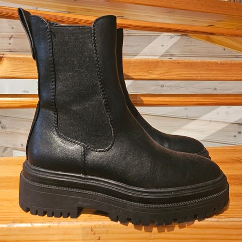 Svarte skinnboots med ekte pelsfor, varme og lette med god, grov såle. Litt liten i størrelse. Er som nye, ubetydelig brukt. Nypris ca 3000