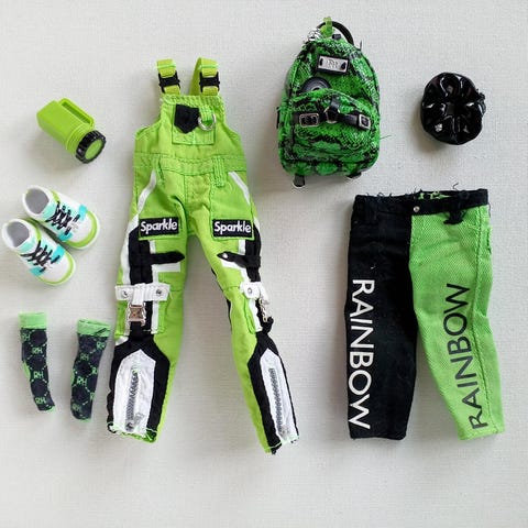 Selges som vist på bildene med stativ og to komplette antrekk. Genseren med striper er sydd under en arm og skjørtet mangler noen nagler. Jade har også en flekk i pannen jeg ikke har forsøkt å fjerne. Ellers er alt i pen stand 🙂💚🖤