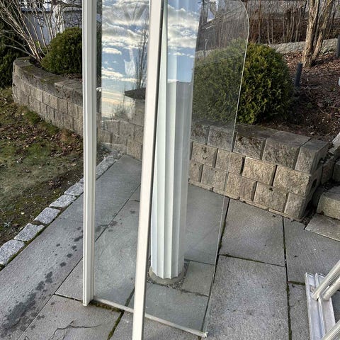 Badekarvegg i glass med aluminiumsramme, egnet for montering på badekar. Størrelse: 75cm*140cm. Produktet inkluderer hengsler og skruer, og har en transparent glassflate. Passer til bruk i baderom for å forhindre vannsprut ved dusjing. Døren kan svinges. Må hentes. Er pakket godt inn for transport.