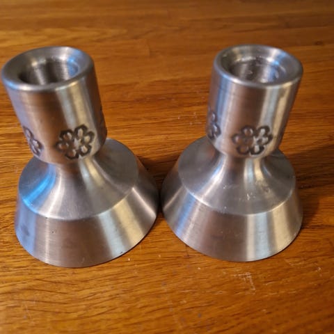 Pene og solide vintage lysestaker i tinn. Antageligvis fra 1950-tallet. Pris for begge to.