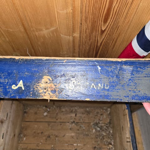 Sengen har naturlig patina, slitasje og merker etter alder og bruk, noe som gir den sjel og autentisk karakter. Det finnes noen riper, flekker og ujevnheter i treverket (se bilder), men konstruksjonen er solid og stabil.