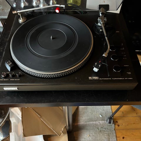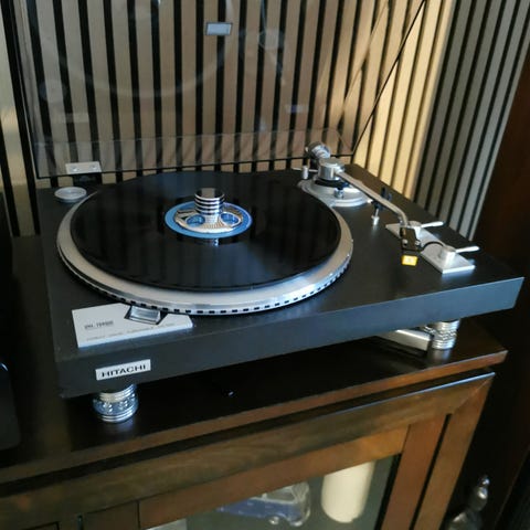 Hitachi platespiller med klar støvhette. En analog lydavspiller for vinylplater, egnet for bruk i hjemmeunderholdningssystemer.