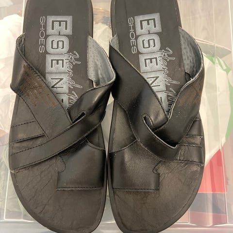 Nye sandaler i skinn, størrelsen står 44, men passer en som har 45.