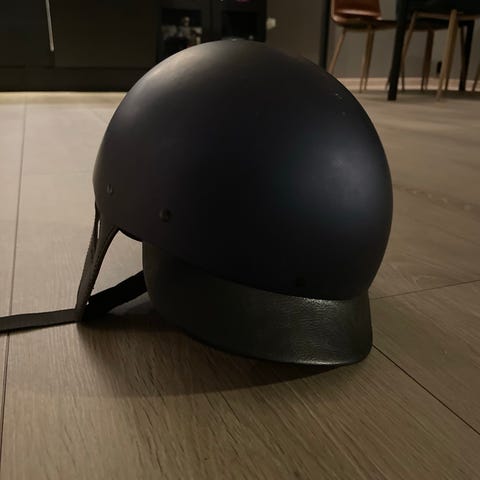 Hjelmen er finntack, trekker medfølger om ønskelig er litt slitt bak, men den sitter godt på enda. Hjelmen er i størrelse 50