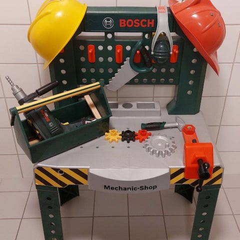 Morsom arbeidsbenk med div verktøy/tilbehør. Noen bruksmerker, men masse lek igjen 🥰🪚🪛👷👷 👷
