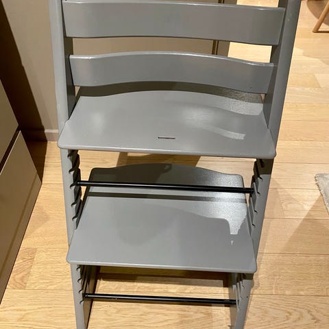 Stokke Steps barnestol i hvit og trefarget utførelse.