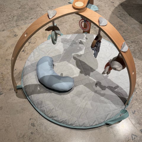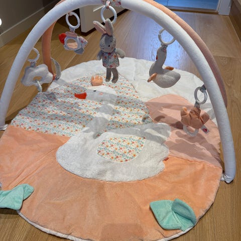 Babygym med 5 leker som kan henges opp i bøylen. Trekket er vendbart med ulike mønstre, se bilder. Et sted på bøylen hvor en bit av treverket har falt av, bare kosmetisk og ikke synlig om man ikke ligger under babygymmen, gjør ingen ting med funksjonen, se bilde. Kjøpt brukt i fjor sommer.