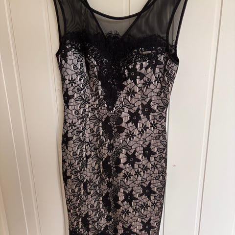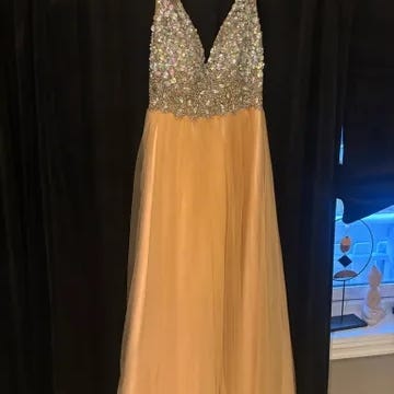 Festkjole i størrelse S, farge oransje. Laget av polyester materiale. Ukjent merke.