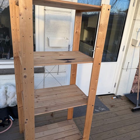 Selger en høy og smal hylle i bambus, samme modell som IKEA RÅGRUND. Hyllen er pent brukt og i god stand, uten skader eller mangler.