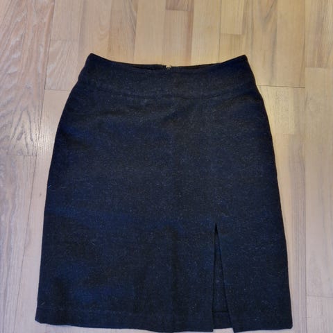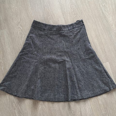 I ull og polyamid, med skjult glidelås i siden. Str 42. Mål i midjen: 90 cm. Skjørtet er 66 cm langt og har pent fall. Farge: grå.