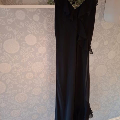 Festkjole i svart farge, størrelse L, med lange ermer. Stoffet har et mønster av små prikker.