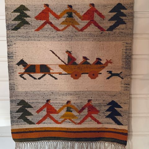 Flott brodert Åkle / Veggteppe i retro farger med smijern oppheng