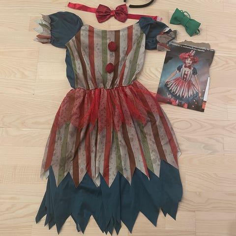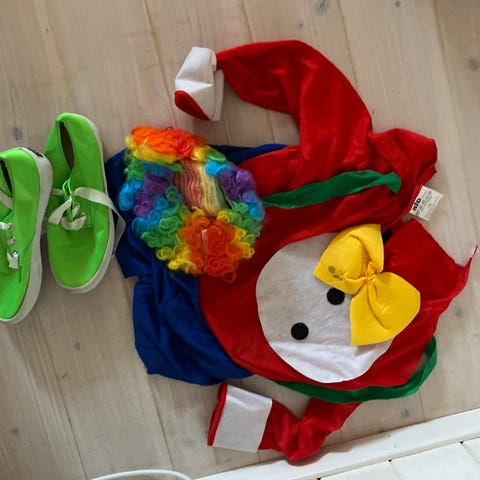 Pent brukt klovnekostyme som inneholder overdel, bukse og hatt. Pent brukt 1 gang.