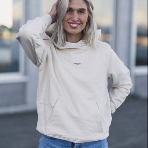 Genseren har hette med knyting og hengerlogoen i sort i front.