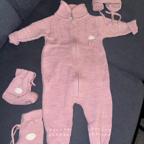 Hjemmestrikket ulldress med hjerteknapper - ble ikke med på samlebilde.