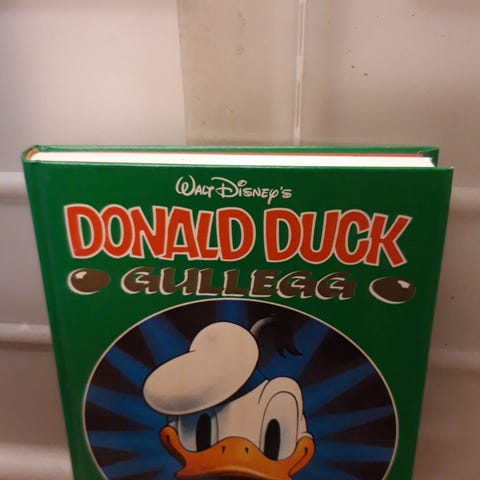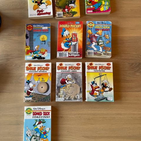 Donald Duck samlede historier bokserie med flere bind, illustrert med klassiske Disney-figurer. Bøkene har fargerike omslag og inneholder tegneserier med Donald Duck og andre kjente karakterer.
