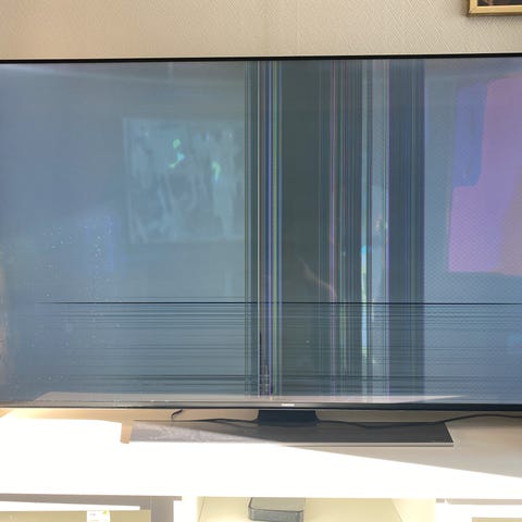 Det finnes noen mindre riper i skjermen. Disse var ikke synlige under normal bruk når TV-en fungerte. Ingen sprekker eller knust panel.