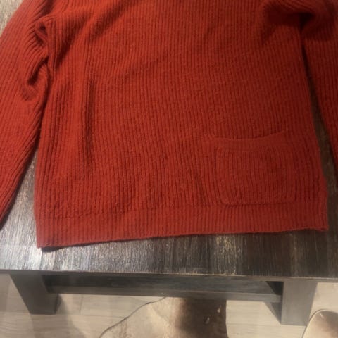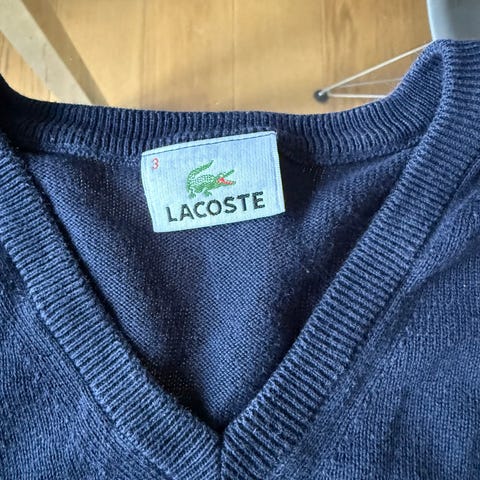 Pure laine wool. Finstrikket ull, så genseren er ikke så tykk, men vil fortsatt varme.