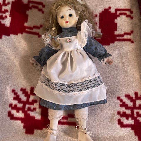 En jente-dukke selges. Hun har på seg strikkede klær og har porselens-ansikt. 38,5 cm høy. Det er en veldig tydelig flekk på det ene benet, se bilde. Må hentes, sender ikke.