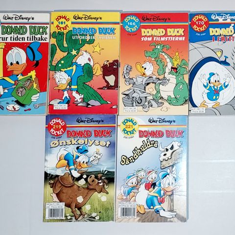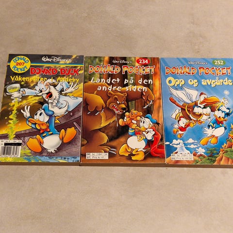 Disney Donald Duck pockets med flere titler og andre kjente Disney-figurer. Litt eldre versjoner, så disse selges for 50kr per stk.