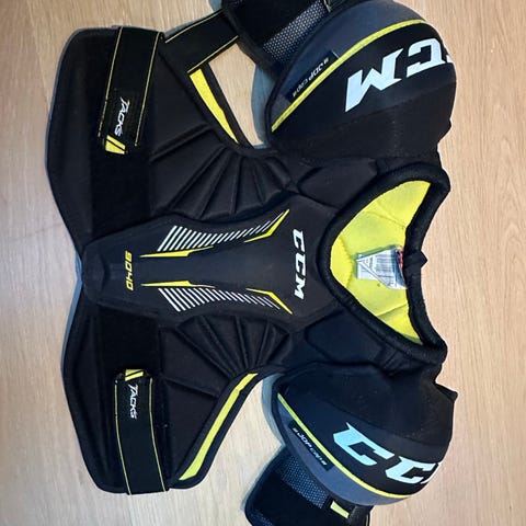 CCM JR ishockey skulderbeskytter med svart og gul farge. Beskytteren er designet for ishockey og gir beskyttelse til skuldrene under spill.