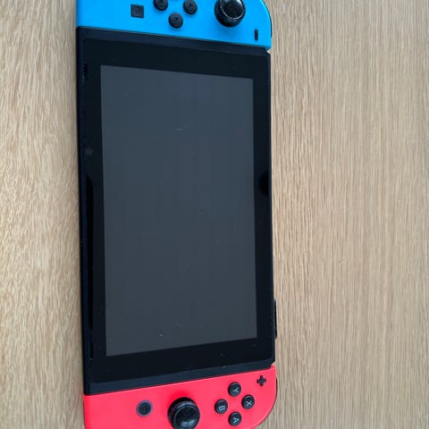 Nintendo Switch konsoll med Joy-Con-kontrollere i blå og rød farge. Inkluderer Pro Controller i svart, dokkingstasjon, ladekabler og ekstra tilbehør. Konsollen har en skjerm for bærbar spillopplevelse og mulighet for tilkobling til TV via dokkingstasjon.