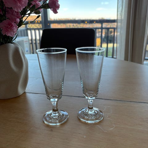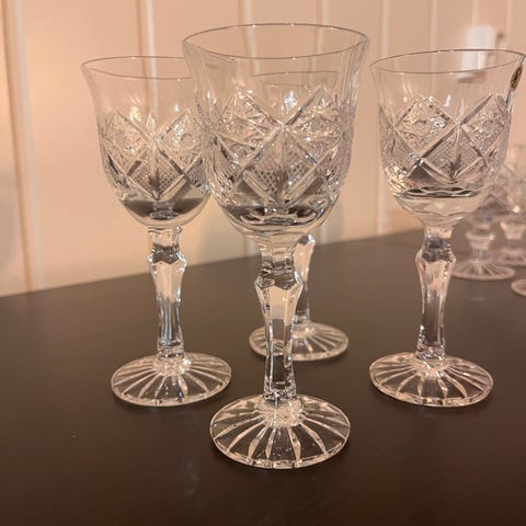 11,5 cm høye. 2 av glassene har noen øresmå nag på kanten.