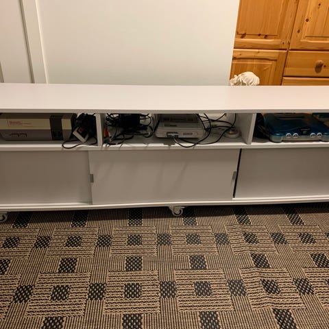 Mediabenk kjøpt på homeroom for ca et år siden. Ingen hakk. Perfekt for hjørner, gir god utnyttelse av rommet. To skuffer under. Selges 1000 kr. Må hentes i Klæbu. Se bilder for mål og førpris.