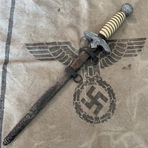 Selger her en tysk dolk for offiser i det tyske Wehrmacht. Den har en bulk i balgen, som ofte skjedde i forbindelse med lukking av bildør. Produsentmerking på bladet, Rich. Plümacher & Sohn.
