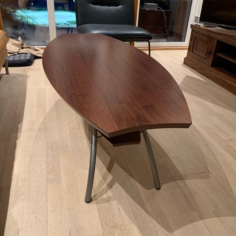 Pent brukt sofabord med mål 140x70x40cm selges, har en mindre skade på et hjørne (se bilde, er ikke merkbart i vanlig bruk) bordet kan åpnes og blir 50,5cm høyt. God lagringsplass nedi og man kan fortsatt ha ting på det oppslått. Pris kan diskuteres, kom med bud! Bordet må hentes.