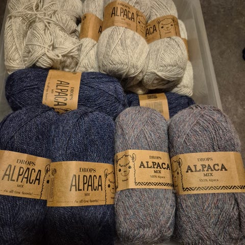 Drops Alpaca, både mix og ensfargede i flere farger. 300 g brun, 140 g orange mix, 100 g petrol mix og mellom 16–50 g av enkeltfarger (se bilder for eksakte mengder). Selges samlet for 300 kr. Kommer fra et husdyr- og røykfritt hjem.