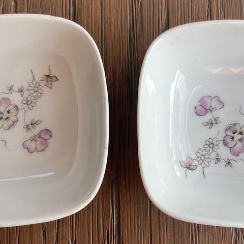 Fem pene små skåler i asiatisk/blå-hvit stil.