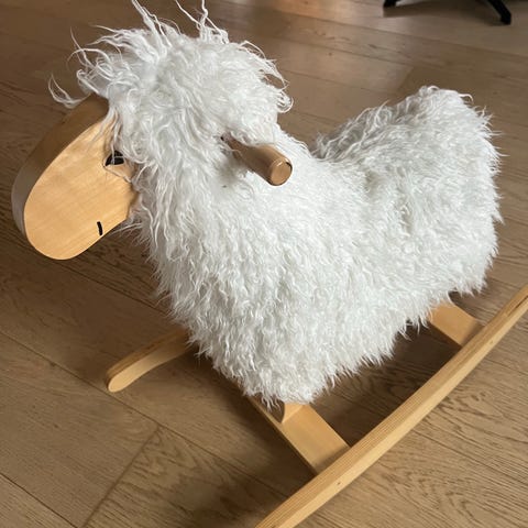 Gyngedyr for barn med stofftrekk i grå og hvit. Gyngedyret har håndtak i tre og en base i tre som gir stabilitet. Designet for barn og egnet som leke- og sitteplass.