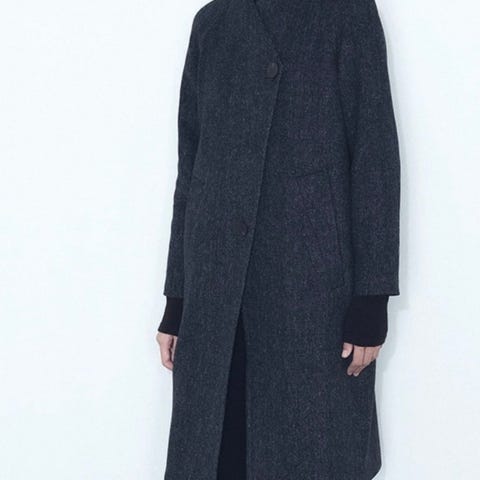 Lang kåpe i ullblanding med et tidløst og minimalistisk uttrykk. Den har stand-krage, droppede skuldre og skjult knappelukking foran, som gir et rent og elegant preg. Avtagbart belte i samme stoff gjør at kåpen kan brukes både rett og innsvinget i midjen. Praktiske innfelte lommer i livet, splitt i sidesømmene for god bevegelighet og innvendige lommer. Ton-i-ton sømmer.
