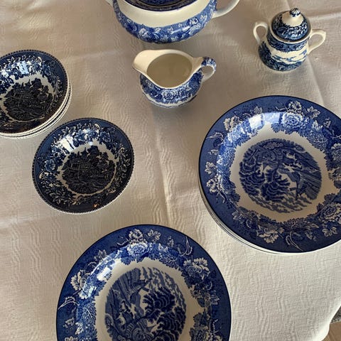Engelsk blått og hvitt servise