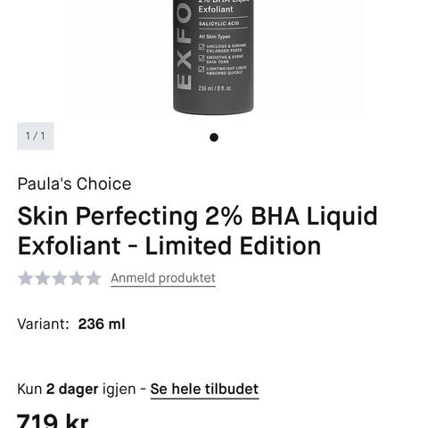 Nesten helt full Paula's Choice 2% BHA Liquid Exfoliant, inneholder salisylsyre. Produktet er designet for eksfoliering av huden og kan brukes en til to ganger daglig på ansiktet etter rensing. Passer til bruk på alle hudtyper og er uten parfyme. Dette er den store flasken, 118 ml. Vegansk og ikke testet på dyr.