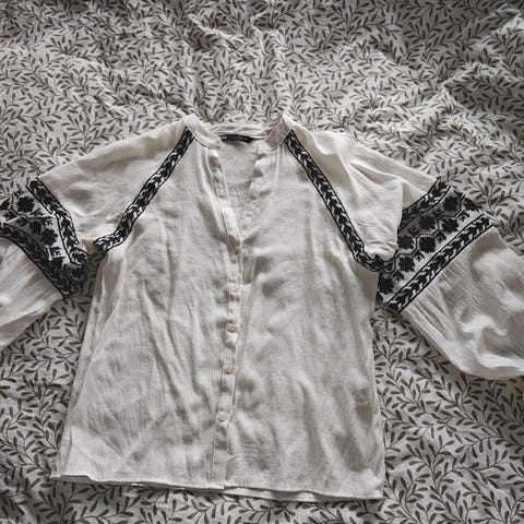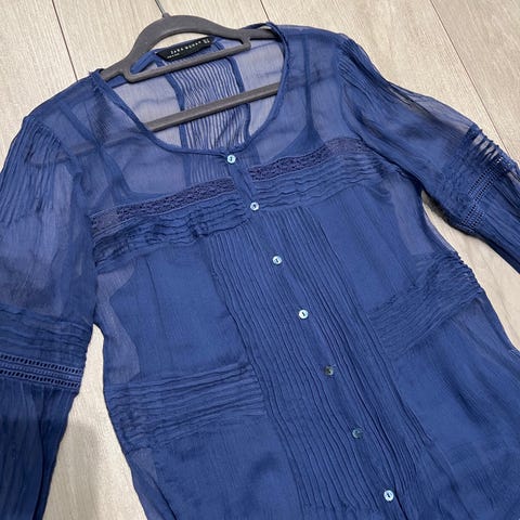 Zara bluse i størrelse M for kvinner, laget av polyester. Blusen har en blå farge og er designet med detaljer som gir et dekorativt uttrykk.